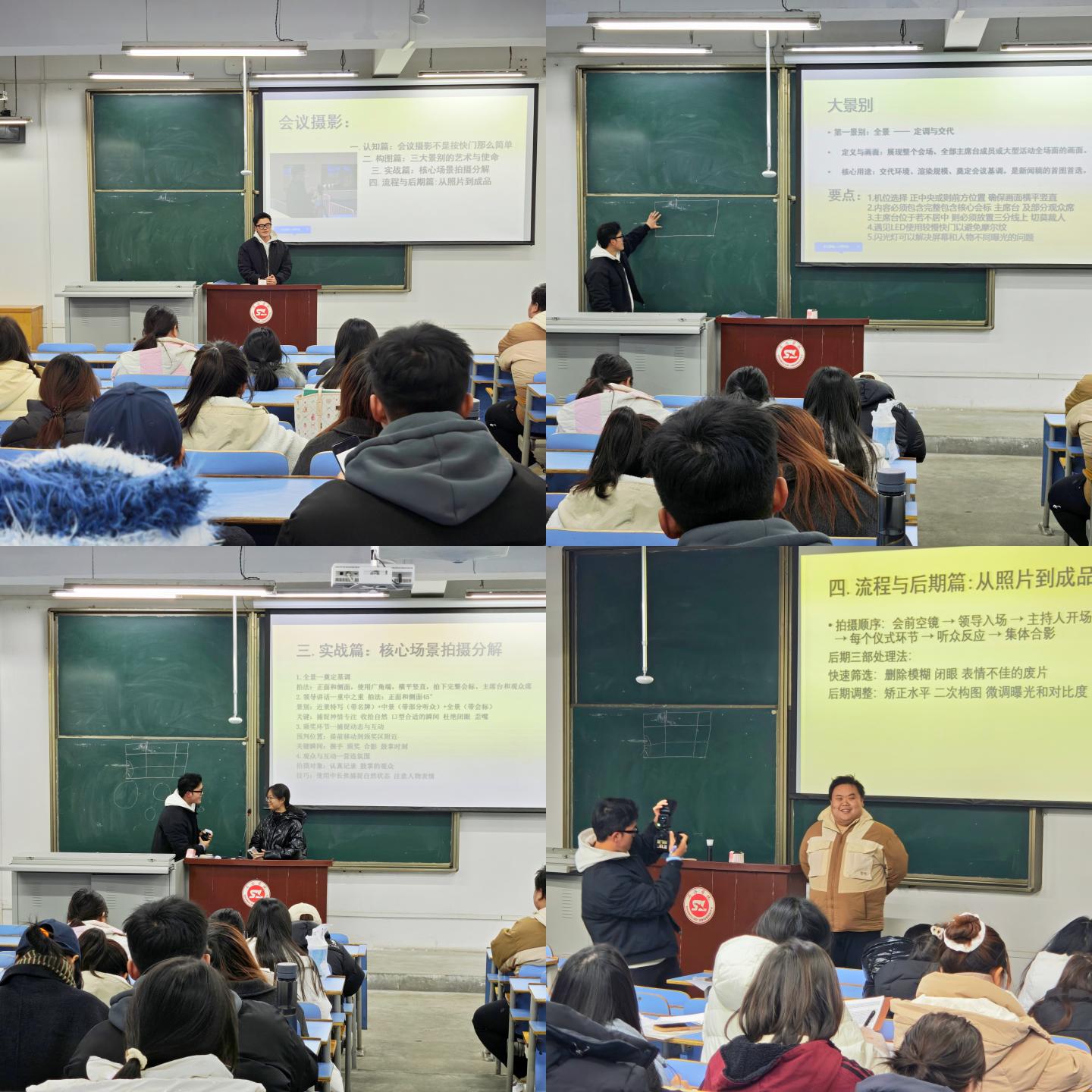 17日晚,何孟洲结合多个拍摄案例深入讲解拍摄技巧。针对人物拍摄不居中、主题缺失、摩尔纹干扰等常见问题,他详细阐释构图原则、明暗调节、闪光灯合理运用等关键技巧。培训中,何孟洲通过现场模拟拍摄的方式与同学们积极互动,直观展示会议摄影的全景定调、中景聚焦、近景捕捉等技巧。培训会进一步明确了会议摄影的规范流程:拍摄需遵循"会前空镜→领导入场→主持人开场→仪式环节→听众反应→集体合影" 的顺序,全景画面作为新闻稿首图首选,需清晰展现会场环境与活动规模;后期处理要采用"快速筛选→矫正调整→优化呈现" 三步法,删除废片后进行水平矫正、二次构图及曝光对比度微调,确保成品质量。