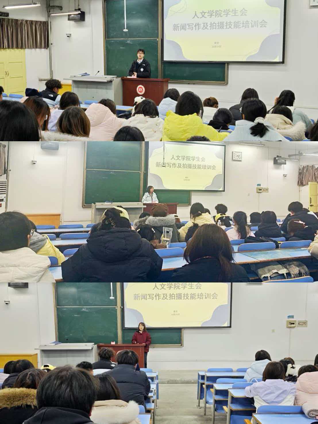 为提升团学干部新闻宣传工作能力,12月16日至17日晚,人文学院学生会在一号楼多媒体1教室举办新闻写作及拍摄技能专项培训会。本次培训会由人文学院团总支书记景宇老师主持并主讲,培训会还邀请网媒2402班何孟洲同学分享拍摄经验。人文学院全体团学干部参加培训会。