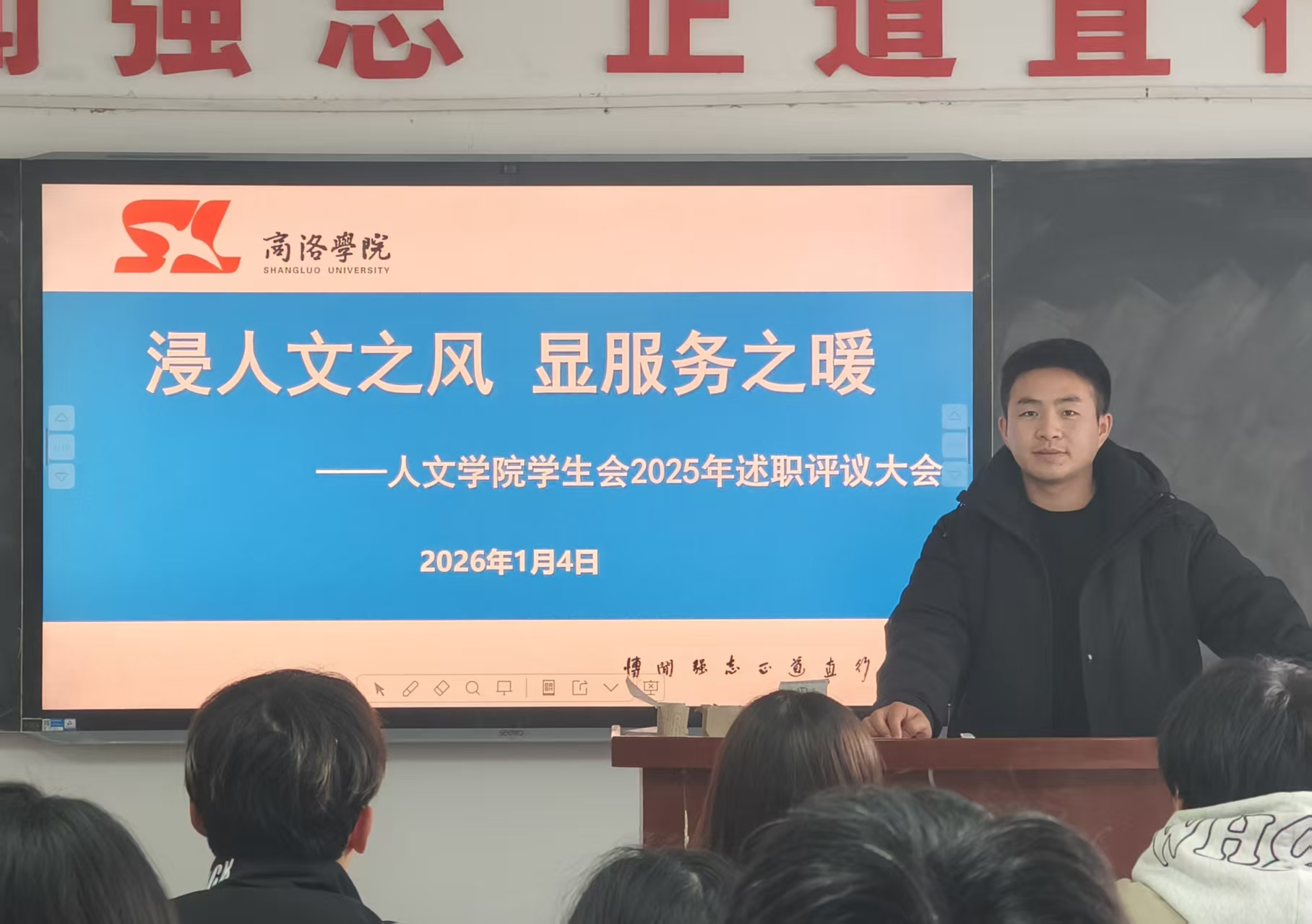 为全面回顾总结2025年学生会工作,进一步提升团学干部服务效能,人文学院学生会于2026年1月4日下午在一号楼401教室组织召开2025年述职评议会。人文学院团总支书记景宇和主席团成员组成述职评议委员会对学生会各部门负责人履职情况进行评议打分。会议由景宇主持。