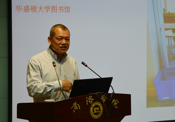 报告会上,岳红记结合自身经历讲述了他在美国东南密苏里州立大学研究中国书法的过程。他指出,要充分利用所在学校图书馆的资源,充分利用大学博物馆及其它博物馆的资源获取第一手研究资料,要多与合作导师及其他教授沟通,拓展自己的研究视野。岳红记的研究课题是《美国现存北朝造像题记书法研究》。他说,在搜集资料的过程中,通过与其他老师的交流,对《社会变革对当今艺术的影响》《福克纳早期绘画对其小说艺术的影响》《美国历史资源保护(历史建筑)的现状及发展》《美国的乡村建筑》《美国基础教育的现状》等产生了兴趣。岳红记还通过传播中国传统文化提升自己的研究水平,例如举办专题讲座、举办书画展、参加学术会议、参加留学生新年晚会等,并通过参加外国人举办的周末家庭聚会、野餐聚会、生日聚会等非正规的聚会传播中国文化。