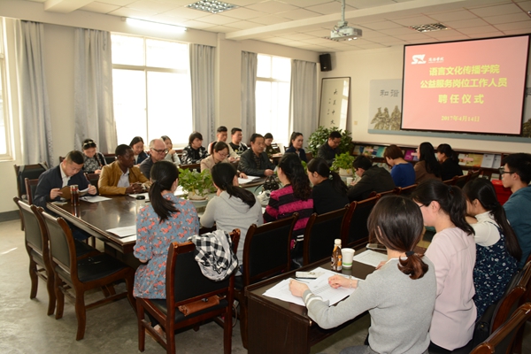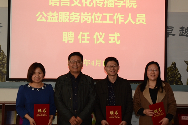 4月14日下午,我院举行公益服务岗位工作人员聘任仪式,院长黄元英、大学生人文素养实训中心王叶老师及实训中心各部部长参加了聘任仪式。聘任仪式由副院长杨军主持。