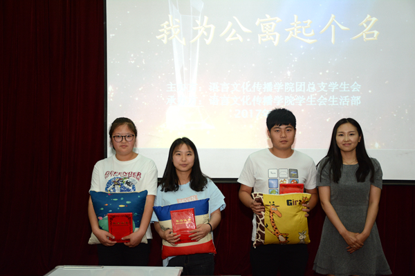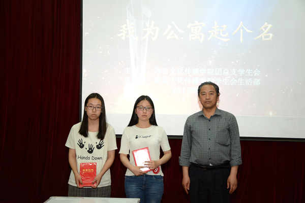 本次活动以“某某楼”的形式为我校13栋男女生公寓楼命名,并要求要有同一个字分别贯穿于男、女生所有公寓楼;结合我校实际,命名高雅励志、且有文化内涵。截止活动结束,共收到有效稿件36封,经过多方评选,最终有16封稿件脱颖而出,来自汉语1405班的梁亮夺得了本次大赛的桂冠,她以“思”字贯穿于全部的公寓楼,分别为一号楼:尚思楼,二号楼:始思楼,四号楼:皓思楼,六号楼:文思楼,十号楼:怀思楼,十一号楼:储思楼,十二号楼A:仰思楼,十二号楼B:沈思楼,十三号楼:濯思楼,十四号楼A:念思楼,十四号楼B:至思楼。来自汉语1501班的宫琳珂、秘书1601班的杨文雪获得本次比赛的二等奖,来自汉语1503班的陈永国、秘书1601班的王玉宇、秘书1601班的杨成方获得本次比赛的三等奖。