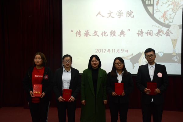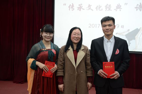 据悉,本次“诗词大会”面向全校学生,分初赛和决赛两个阶段进行,共有百余名学生报名参加了初赛。经过激烈预选,一共选出10名诗词达人进入决赛。此次决赛共分为两轮。所有题目都以ppt形式展出,选手只需作答即可。第一轮比赛通过多样的答题形式,让参赛选手和观众体会到诗词文化丰富的内涵,选手们快速的反应与回答也得到观众热烈的掌声。经过第一轮精彩的对决,其中六名选手通过各自出色的表现成功晋级第二轮争霸赛。比赛现场,选手们以其扎实的诗词功底、自信大方的形象赢得了评委老师和同学们的阵阵掌声。中场的互动环节,更是将大会氛围推向高潮。经过一二轮紧张而又激烈的角逐,最终来自我院秘书1701王芳以其丰厚的诗词文化底蕴与精彩的答题获得了本次活动的一等奖,来自我院汉语1705李桃、化材学院材料1601赵威梓获得二等奖,来自我院历史1701齐争争、历史1601刘欢、汉语1605许云茹获得三等奖,我院汉语1602张梦绸、网媒1701莫非凡、秘书1602欧一菲、化材学院化学1701李海英则分别获得优奖。
