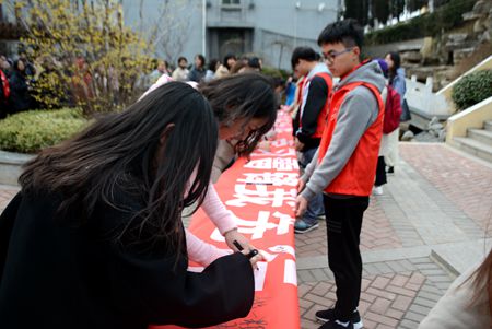 仪式接近尾声,老师与同学们在横幅上有序进行签字仪式。