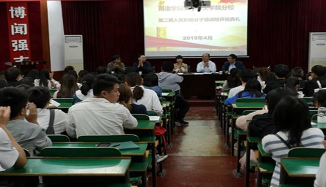2019年4月8日,我院在一号楼二号报告厅进行第二期入党积极分子培训班开班典礼。我院党总支副书记杜明生、党政办公室主任王宗运、学工办主任刘丽娜、学生党支部书记王宝堂、张善红、周瑶及225名入党积极分子参加开班典礼。典礼由王宗运老师主持。