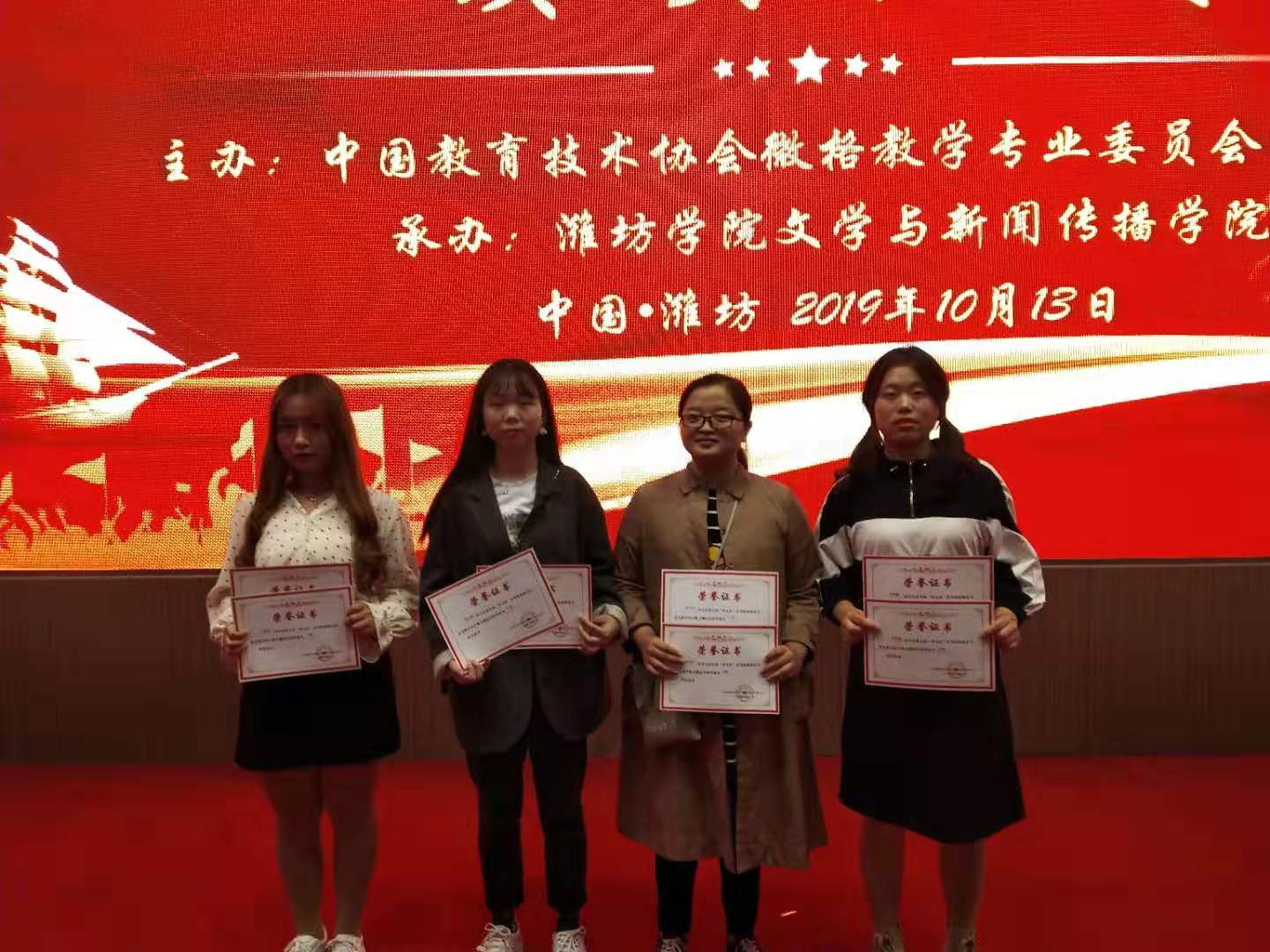10月11日至14日,2019年语文微格教学论坛暨第九届“华文杯”高等院校师范生语文教学能力测试与交流展示活动在山东省潍坊学院举办。我校人文学院2017级汉语言文学专业4位参赛同学凭借良好的精神风貌和扎实的技能功底,荣获一等奖3项、二等奖2项、三等奖2项、优秀奖1项。