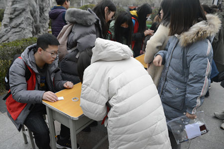 考场内我院考生认真作答,监考老师与安保人员积极巡逻,同时为考生们提供收音机和电池等考试必需品;考场外志愿者们热心提供服务,为考生看管随身物品。