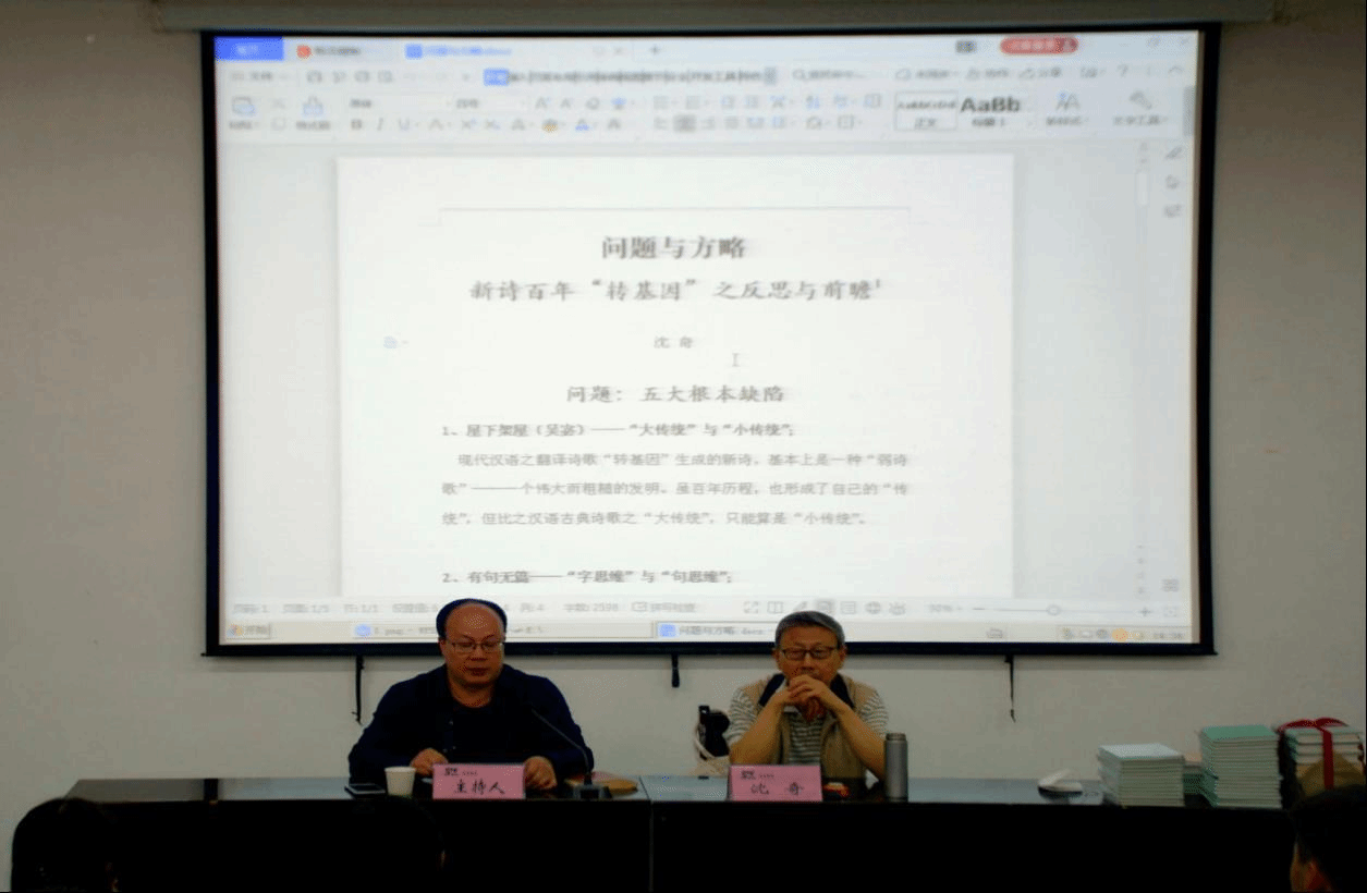 下午2点30分,报告会在我校1号教学楼报告厅一隆重举行,沈奇教授围绕新诗发展的百年历程,结合郑敏、石虎、吴思敬,以及谢冕、孙绍振等专家学者的诸种论辩,经由文字、语言、体统、道统、历史性等多种维度反思百年新诗得失,通过汉语古典诗歌“大传统”与汉语新诗“小传统”的多重思考,提出汲古润今、重构传统的“八个通和”诗学论断。人文学院中文系老师、商洛诗人冀卫军和人文学院中文系、网媒系学生共计二百余人参加了此次报告会。