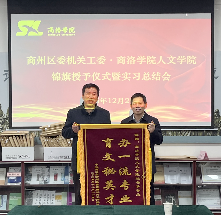 会议伊始,商州区委机关工委向人文学院授予锦旗,以此对人文学院秘书学专业实习生在实践岗位展现出的专业素养、务实作风和良好精神风貌表示高度认可与诚挚感谢。金红卫和张文诺分别代表各自单位授旗和接旗。