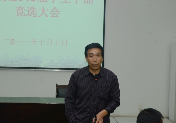 为加强我系学生干部队伍建设, 进一步推动团学工作的开展, 10 10 日晚,我系一年一度的学生干部竞选大会在报告厅一隆重举行。中文系党总支书记张彦民,团总支书记付栋,以及辅导员赵文英、李斌、黄璜出席本次会议, 10 级学生干部考察委员以及 11 级全体学生参加了会议。会议由系学生分会主席万磊主持。