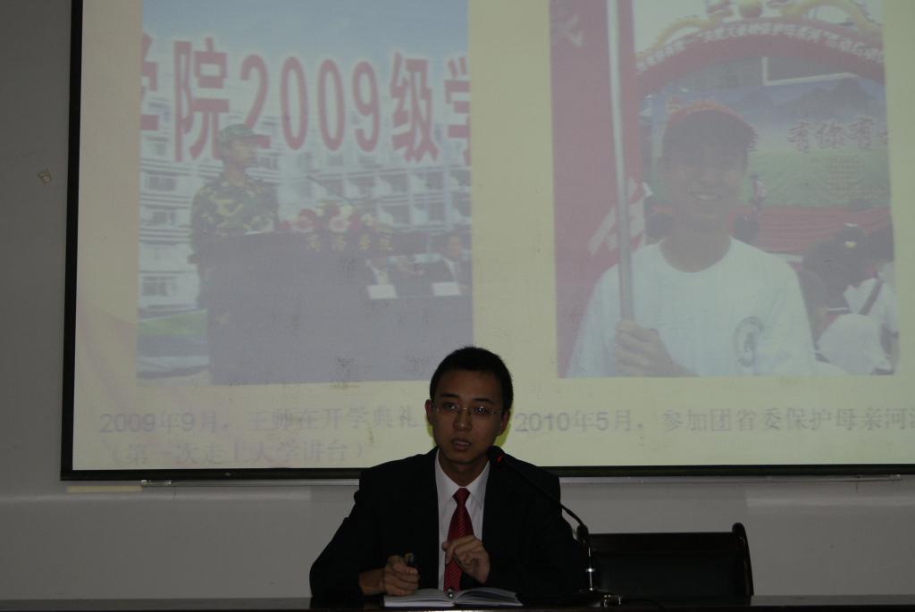 王帅,在一号楼报告厅一为我系汉语言文学和文秘教育专业新生作个人成长交流报告。本次交流会由中文系学生分会主席李军主持。