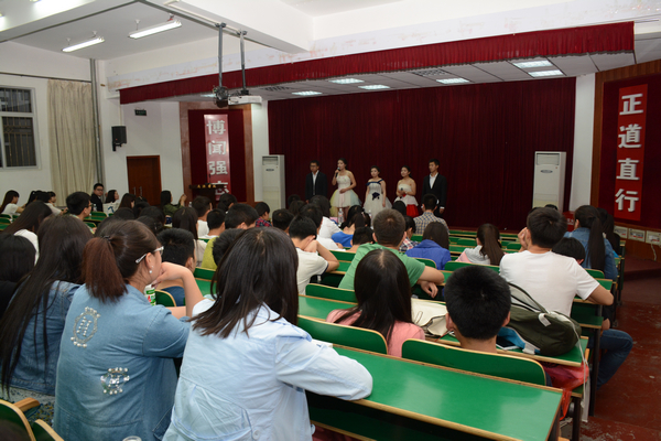 5月20日晚,我院在报告厅二举办中华经典诗词散文朗诵大赛。院党总支书记王正良、教学督导组组长杨莉、秘书学系主任张晓倩、大学生人文素养实训中心主任许薇、院团总支书记、大学生人文素养实训中心副主任芦晓立、辅导员周瑶担任评委,我院2014级学生到场观摩。
